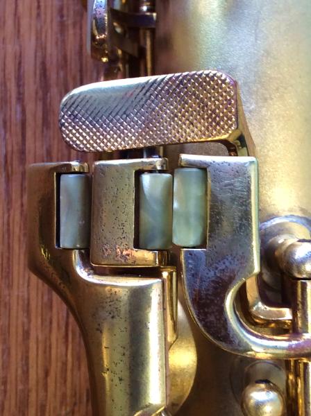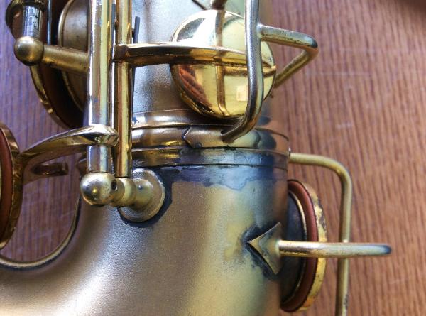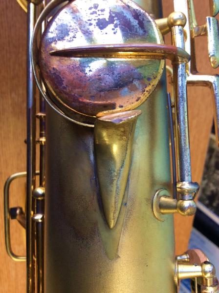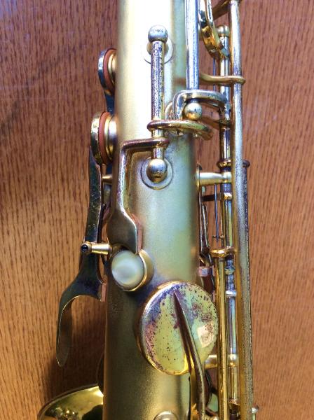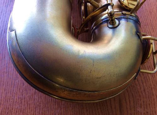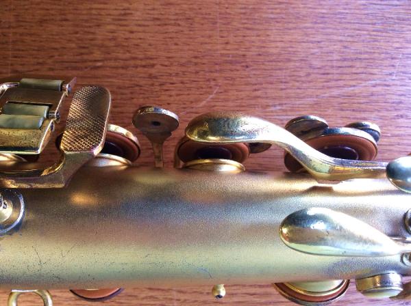 | The satin gold plated finish is about 80% intact, with some wear on the keys and front of the bell. |