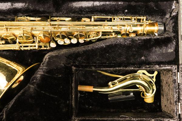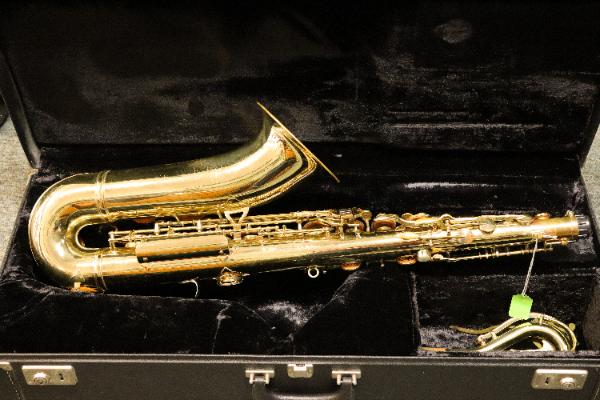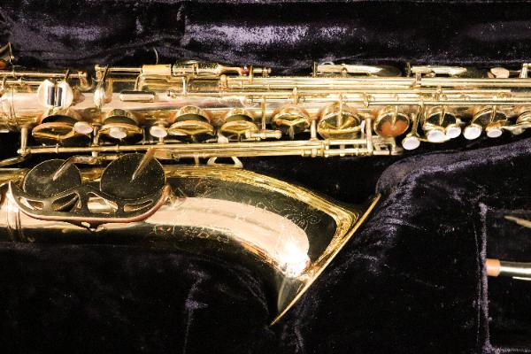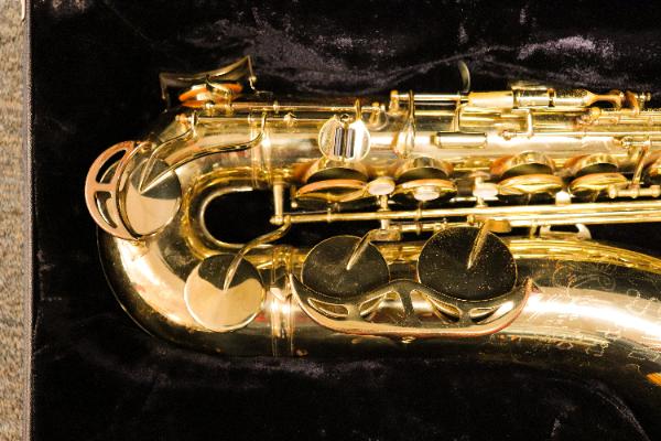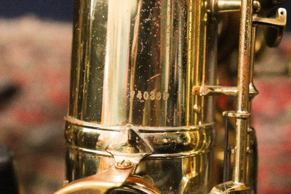 | King Super 20 #740338. Here we have a horn that, strictly speaking, shouldn't exist, because records for King Super 20 serial numbers ended after 540xxx in 1975. There are many possible explanations for this phenomenon, including that these uncharted horns were assembled from the last few Super 20 parts after production had ceased. The Super 20 is well-loved by horn players for its lush tone, and sturdy, "beefy" bodywork. Comes with a case. |